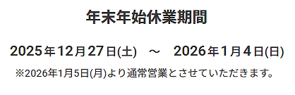 年末年始休業期間について、以下の通りご案内いたします。 【年末年始休業期間】 2025年12月27日(土) ~ 2026年1月4日(日) ※2026年1月5日(月)より通常営業とさせていただきます。