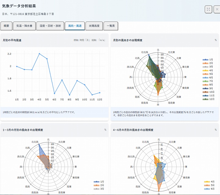 これは、アメダスの実測値をもとに、全国各地の気温・風向などの気象情報を取得できるツールでして、住所を入力すれば誰でもその地点における気象情報がすぐに調べられる優れモノです。凄い・・・