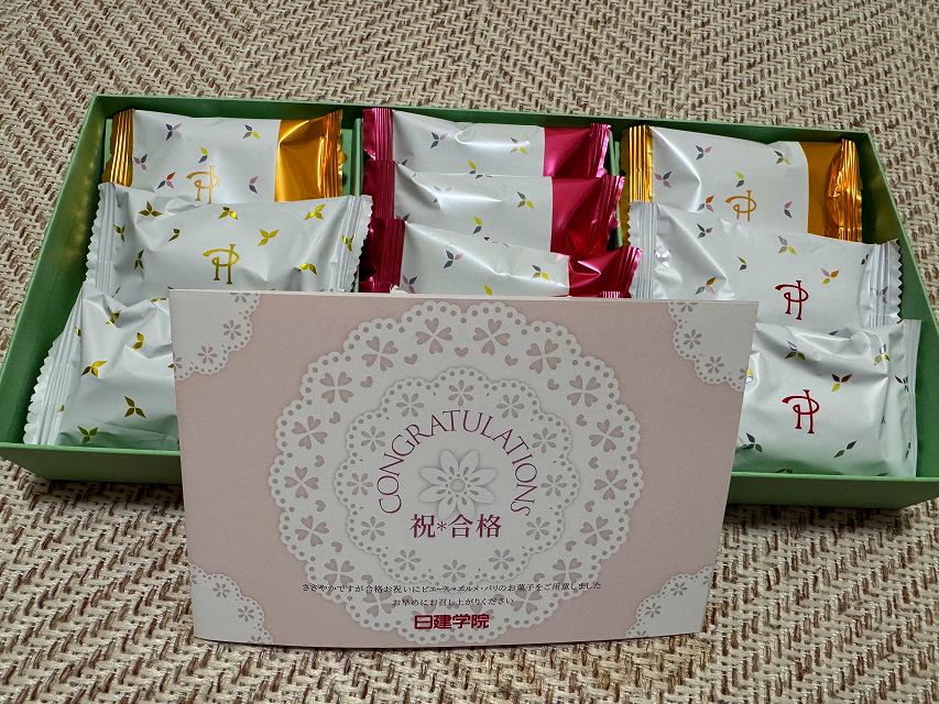 後日、資格学校からもお祝いの言葉とお菓子を頂いて、
